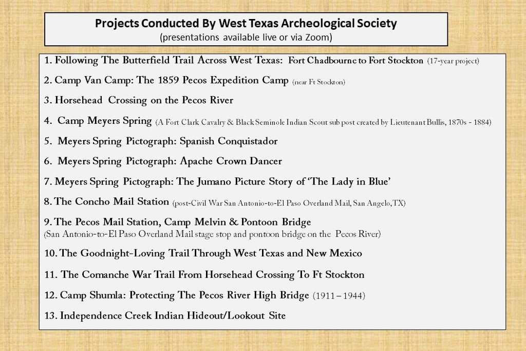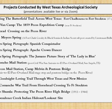 We are an organization of avocational archeologists and historians interested in re-discovering lost history in the West Texas Region known as the Trans Pecos and the Concho Valley. This covers the southern border and Rio Grande area, up to Midland, and the western Concho Valley. Our projects mainly cover the historic period. Our projects use archeological procedures with deep-source document research. Our reports are provided to universities, professional publications, and historical archival centers interested in this region. This website is our effort to make those reports, videos, and events available to the general public. Membership is free.