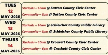 May 13: Library presentation for school students and the community of Eldorado, TX