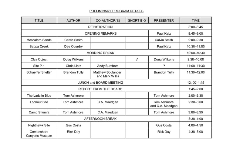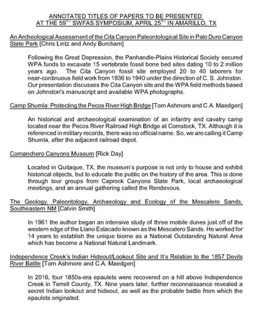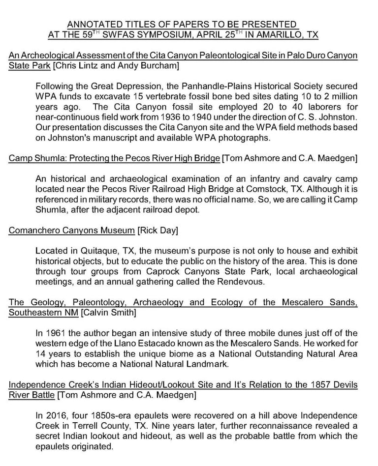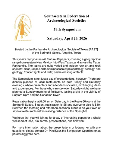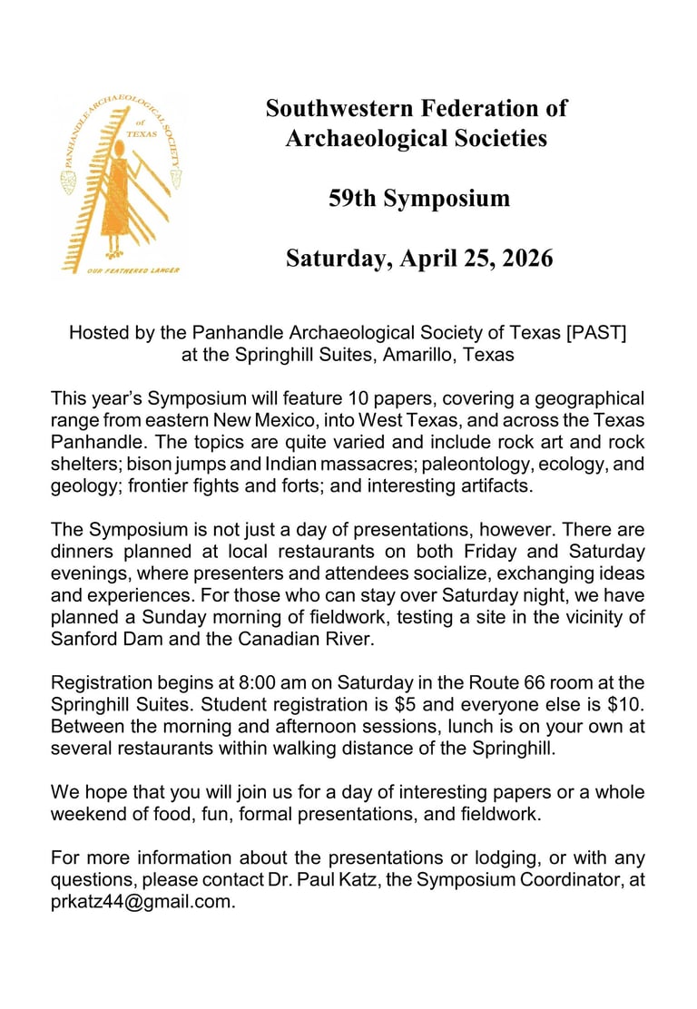 Apr 25: Southwest Federation of Archeological Societies’ Symposium, Amarillo, TX